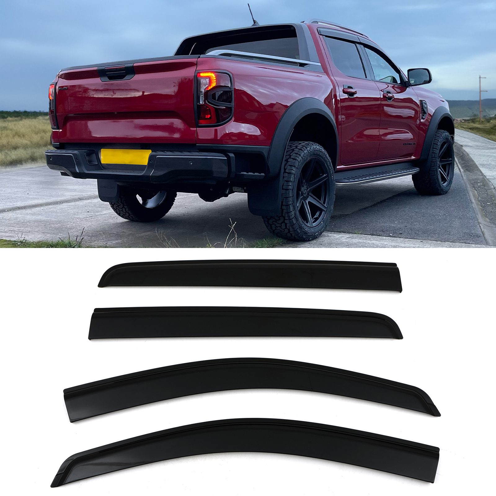 Ford Ranger T9 2023+ models Please note these wind deflectors are fitted to the outside of the vehicle with 3M Tape.